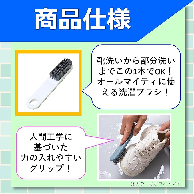 【襟・袖の汚れに特化した洗濯ブラシ】 Yシャツの襟、袖口、ズボンの裾など、頑固な部分汚れをピンポイントで落とすのに最適。シミ抜きや下処理にも活躍します。