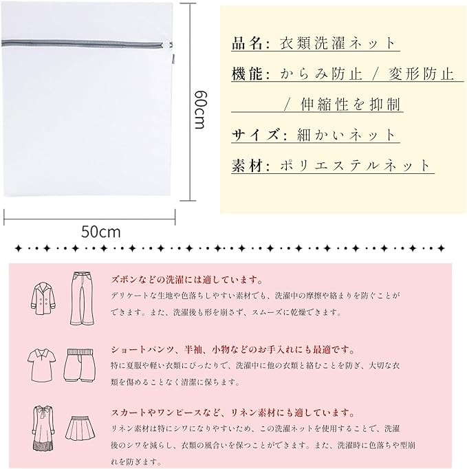 【便利な3枚セットと多用途の使い方】 本製品は、60 50cmの大サイズの3枚セットで、家族全員の洗濯ニーズに対応します。洗濯専用のランドリーネットとしてはもちろん、旅行や出張時には衣類を種類ごとに分けて収納できる仕分け袋としても活躍します。また、家庭内の衣類収納としても便利に使え、おもちゃや小物の整理にも役立ちます。さまざまな用途に対応できる多機能性が魅力です。
