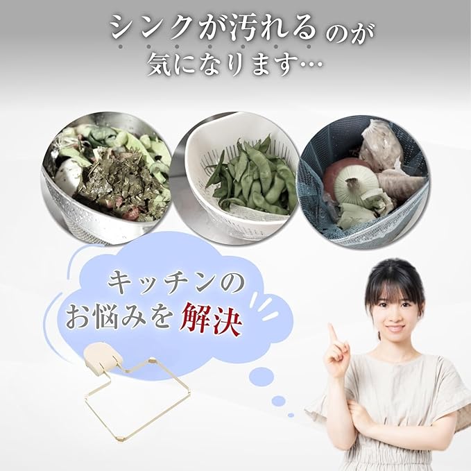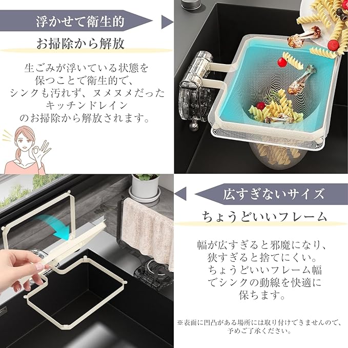 【衛生的で手間いらず】三角コーナー 水切りネットとして活用できる本製品は、ネットをフックに掛けるだけで生ゴミが直接シンクに触れるのを防ぎ、衛生面をしっかりキープ。300針の高密度ネットで細かい食材カスやスープも効率よく濾過でき、排水詰まりの予防にも役立ちます。