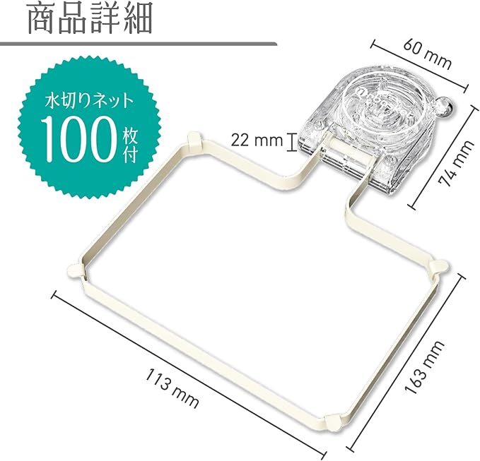 キッチンの衛生管理を簡単に、効果的に この水切りネットホルダーは、シンクを清潔に保ちながら、生ゴミの処理を効率化する便利なアイテムです。省スペース設計と使い勝手の良い構造で、毎日の家事をスマートにサポートします。 【セット内容】 水切りネットホルダー(ホワイト) 1 使い捨て水切りネット(100枚)