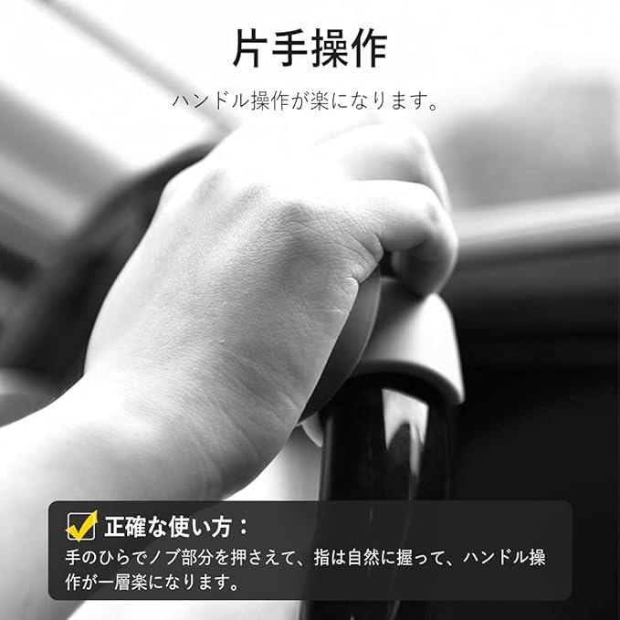 【片手操作】ステアリングホイールノブを取り付て、片手でも簡単にハンドルを取り回しができます。両手で運転が難しい方或いは腕は不便があった方に対して、ハンドルスピンナーは運転補助具としても利用されます。