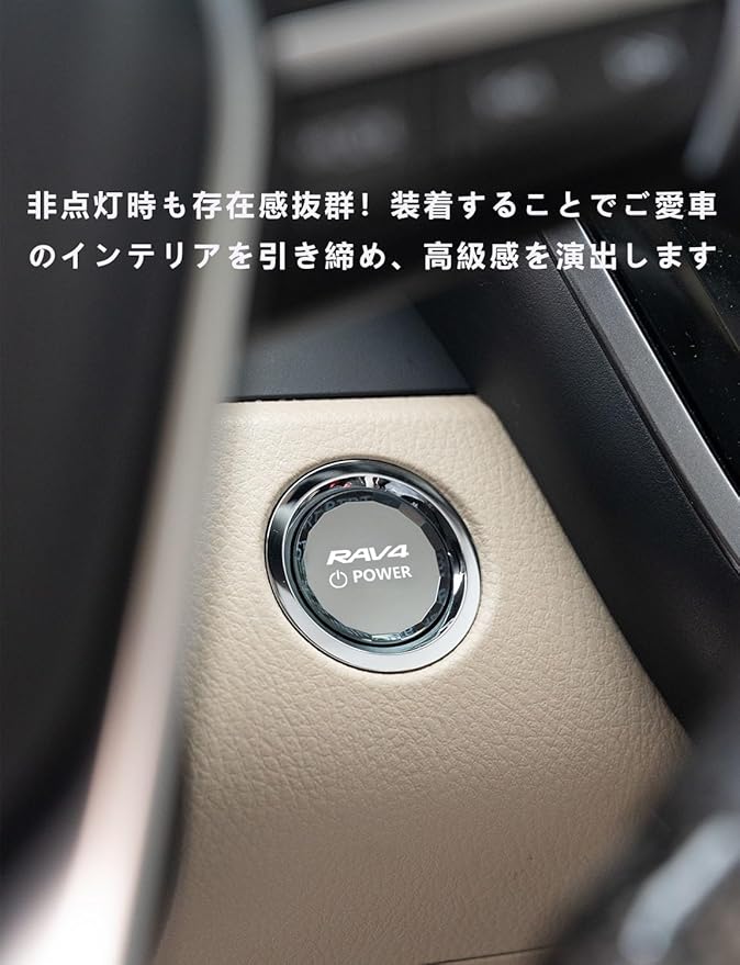 【特徴】このRAV4車に適用するスタートボタン スイッチカバーはクリスタル表面処理で文字部分はくり抜きになっているので純正のLEDはそのまま光ります。 スターターリングが非点灯時も存在感抜群!装着することでご愛車のインテリアを引き締め、高級感を演出します。さらにPOWERロゴ入りで、スタイリッシュな印象を引き立てます。
