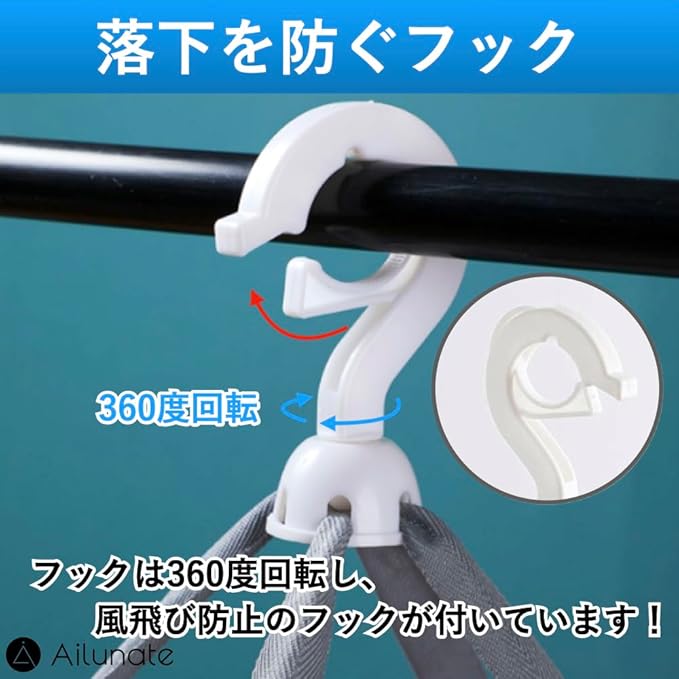 ✅【落下を防ぐフック】フックは360度回転し、風飛び防止のフックが付いており、物干しネットが落下することを防ぎます。