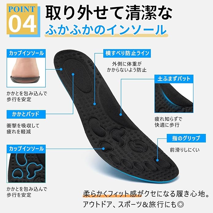 【通気性、弾力性に優れたクッションが衝撃を吸収】中敷きはふかふかの低反発クッションをセットしており、ゆっくり沈んでゆっくり戻るタイプで衝撃をはじくのではなく独特の包み込むような衝撃吸収をします。汗や汚れが気になったら、インソールも本体も丸ごと水で手洗いOKです! 便利ポイントいっぱいの1足、ぜひ一度お試しくださいませ♪
