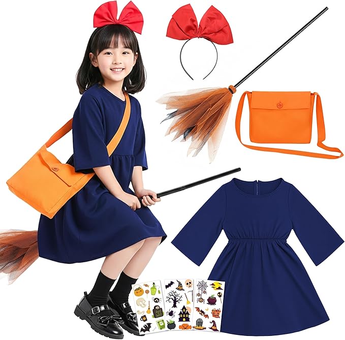 [COZENRE] 魔女キキ コスプレ 子供 ハロウィン 仮装【リボンカチューシャ+ワンピース+バッグ+ほうき+ハロウィンシール*3】7点セット 衣装 cosplay コスチューム レディース 子供コスプレ 女の子 萌え 可愛い 魔女の宅配屋さん 舞台演出服 文化祭 学園祭 子供用