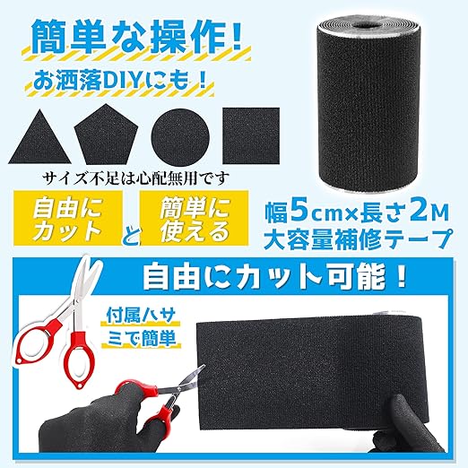 【便利なセット内容】 ハサミ付き!5cm 2mの大容量補修テープ,2mのロングサイズで広範囲の補修が可能!付属のハサミで必要な長さに簡単カットできます。ブラックカラーで目立ちにくく、車内装・家具・カバンの目立たない補修に最適。家庭・ワークショップ・アウトドアなど、あらゆるシーンで活躍します。