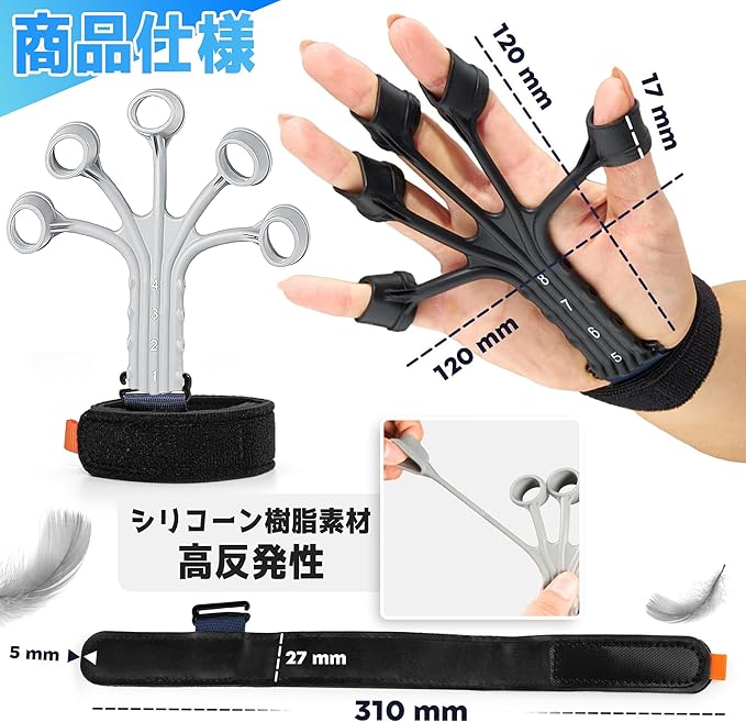 【製品仕様】フィンガーパワーの、柔軟性や弾力性に優れ、引き裂き強度も抜群です。セットにはブラックとグレーの2個のフィンガーパワーと2つのリストバンドが含まれています。
