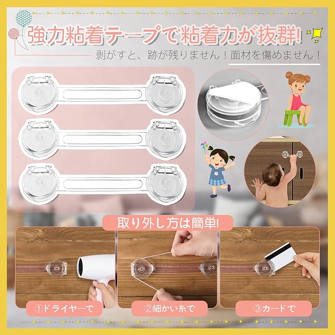 【簡単設置&片手でロック解除】工具を使わずに、お好みの箇所に強力な両面テープで貼り付けるだけの簡単設置。長いタイプ:ベビーロックの両側の蓋のどちらかでも開けるだけでロック解除されます。短いタイプ:ワンタッチでロック解除!