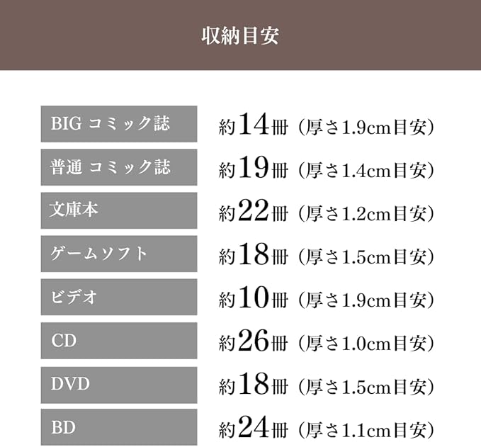 BIGコミック誌:約14冊(厚さ1.9cm目安)、普通コミック誌:約19冊(厚さ1.4cm目安)、文庫本:約22冊(厚さ1.2cm目安)、ゲームソフト:約18枚(厚さ1.5cm目安)、ビデオ:約10本、CD:約26枚(厚さ1cm目安)、DVD:約18枚(厚さ1.5cm目安)、BD:約24枚(厚さ1.1cm目安)