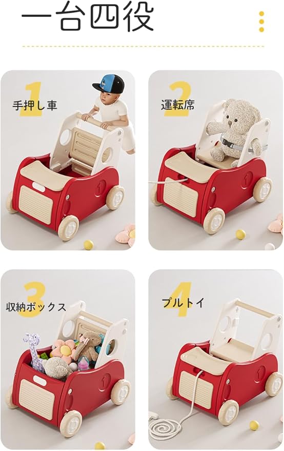 【大好きなおもちゃを積んで歩行練習】ごっこ遊びやお気に入りのおもちゃなどを入れて運んだり、つかまり歩きの練習用としても、屋内専用でおもちゃ箱としても使えます。タイヤは室内で遊んでもフローリングなどの床を傷つけません。