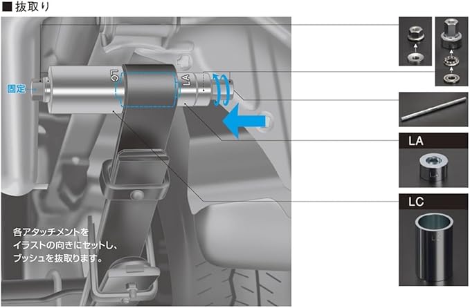 ブッシュを交換するうえでなくてはならない機材といえば、大抵の人が油圧プレスを想像するでしょう。キツく圧入されたブッシュを抜き取り、あらたなブッシュと交換するために必要な設備ですが、整備工場以外で見かけることはごくまれです。また、油圧プレスにセットするには車体からアームを取り外さなければならず、整備工場へ依頼するにしても面倒な作業であることに変わりありません。そこで、これまでの非効率で煩わしい作業を一変させる、サスペンションブッシュ専用SSTを開発しました。“イージーエクスチェンジツール"は、異なる形状のアタッチメントを組み合わせるだけで、抜き取りから圧入までの一連の作業をハンドツールのみで完了できる優れモノです。これさえあれば、プロのメカニックはもちろん、DIYユーザーでも気軽にブッシュ交換にチャレンジできます。