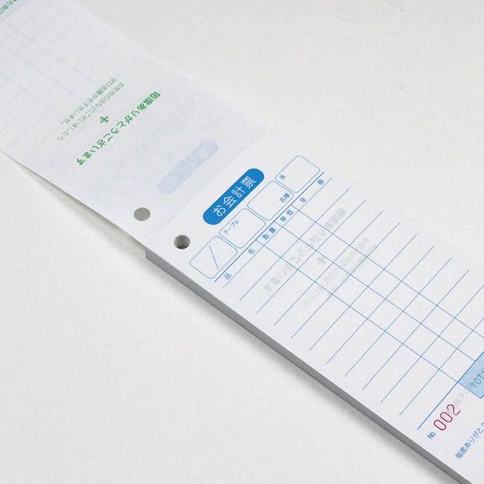 ●製本せず、100枚ごとに裏ボール紙が入って糊付けされたタイプの領収証付お会計票●単式●通しナンバー入(001~100)●1穴付き●ミシン目入り