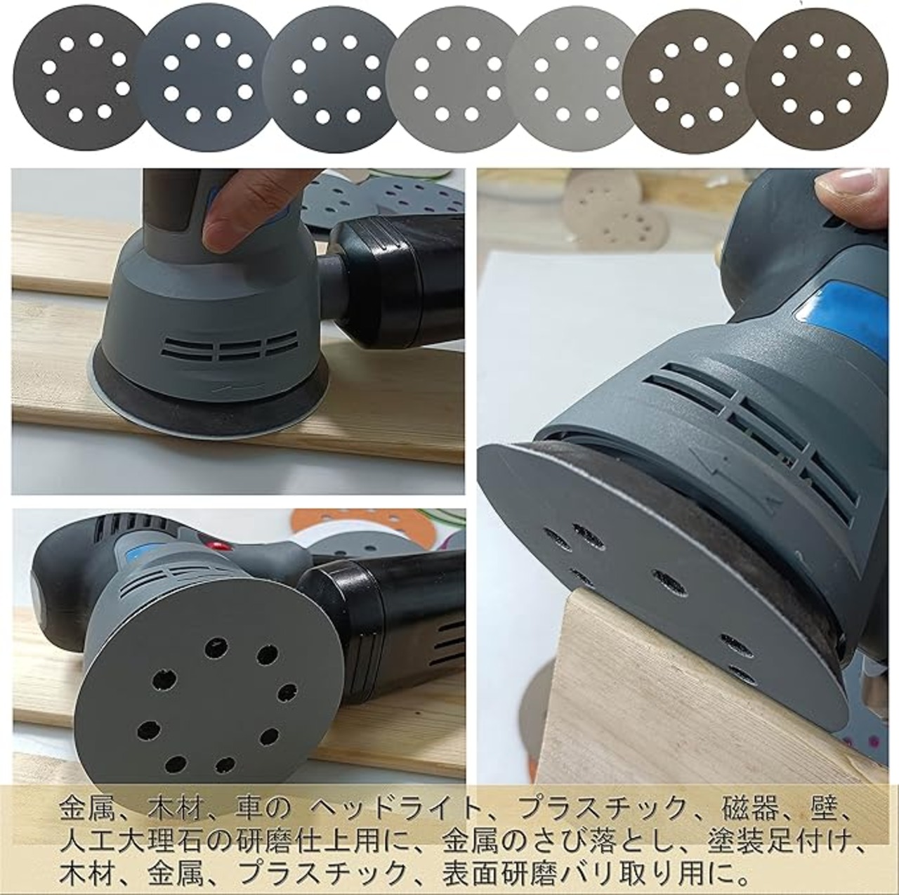 【取り換えが簡単】 直径125mm/8穴タイプのペーパーに対応。粘着性が優れて、とても便利に取り外しや交換することができます。異なる研削ニーズに従って砂の異なるカテゴリーが素早く変えることができ、操作が簡単です。