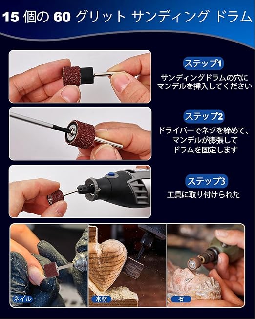 紙やすり セット: 金属、樹脂、木材、鏡、ガラス、オパールの研磨に最適。サンディングバンドは木製品修復やネイルポリッシャーに対応。バフ ポリッシャーと研磨スポンジで滑らかな仕上がり。電動工具対応で手ヤスリより簡単。最大10000RPM、推奨2000RPM以下。