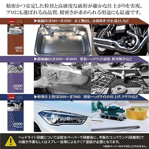 【マルチに使える万能紙やすり】空研ぎだけでなく目詰まりしにくい水研ぎに適しており、樹脂製ヘッドライトの研磨、パテ削りや塗装下地処理、木工やホビー、クラフトでの研磨作業、サビ落としや汚れ落としなど幅広くご使用いただけます。