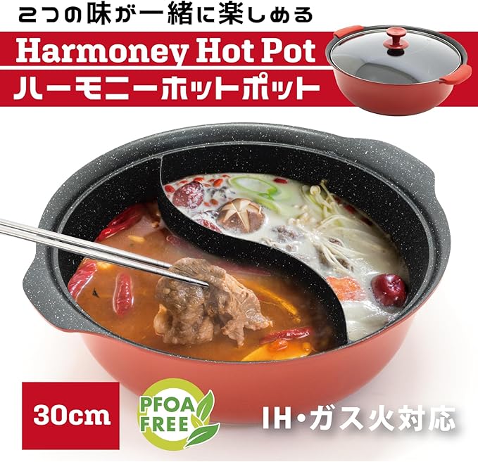 二色鍋 ハーモニーポット ガラス蓋付 フッ素加工 仕切り付き 卓上鍋 両手鍋 鍋 火鍋 しゃぶしゃぶ 鍋 ih 火鍋 二食鍋 ふっ素加工 IH対応 PFOSフリー (30cm)