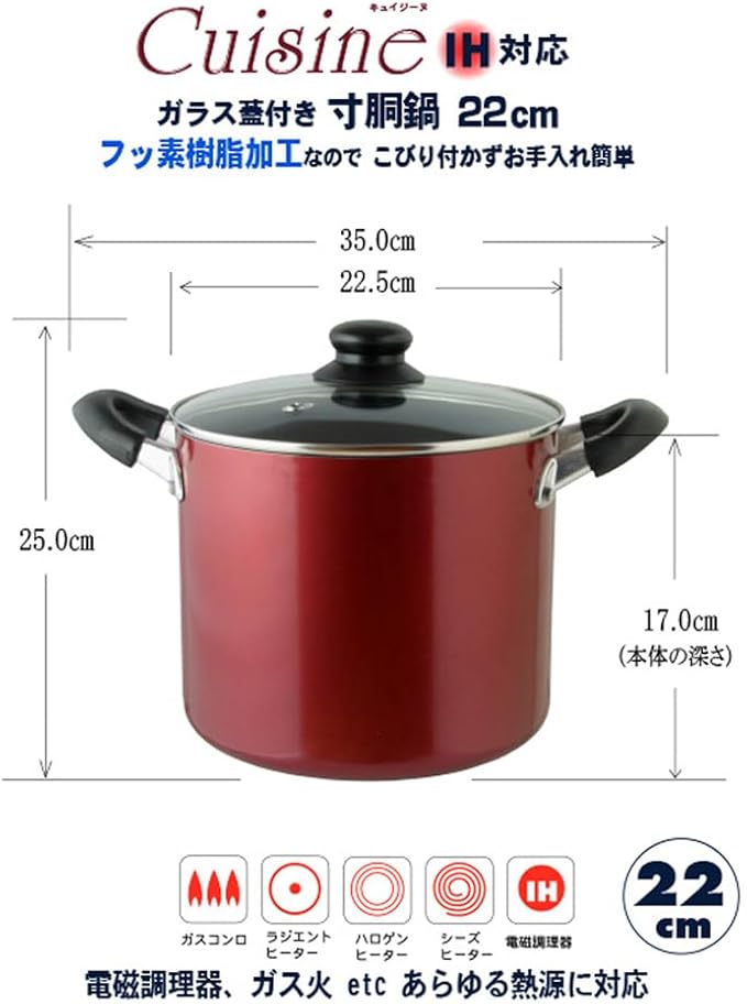 リビング キュイジーヌ 寸胴鍋 22cm ガス火 IH対応 フッ素加工 焦げ付きにくい カレー シチュー レッド 505800