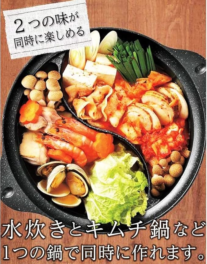 仕切り付きで二つの味が同時に楽しめる便利なお鍋!お手入れ簡単なフッ素加工済みです。辛口好きな方や苦手な方、お子様用のお鍋など異なる味が同時に煮込めるのでみんな一緒に楽しめるのがうれしい!