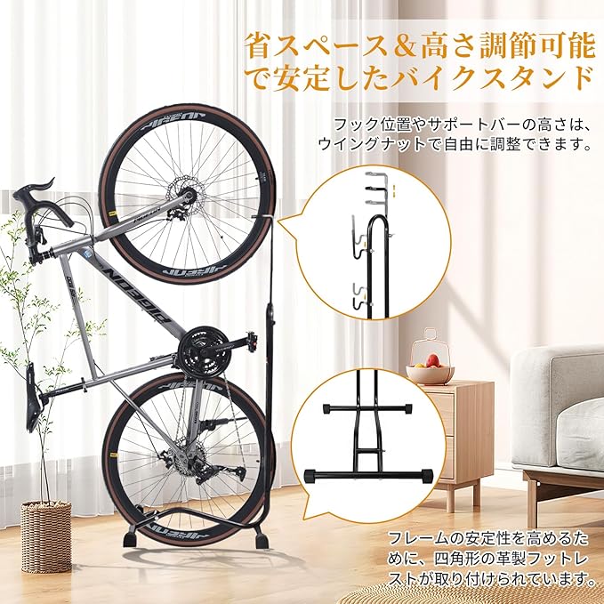 【高安定&安全設計の頑丈スチールフレーム】高品質な鉄製フレームと四点荷重設計により、抜群の安定性と安全性を実現しています。調整可能なU字フックには保護ラバーが付いており、大切な自転車を傷から守ります。さらに、工具不要で簡単に分解でき、収納や持ち運びも便利です。