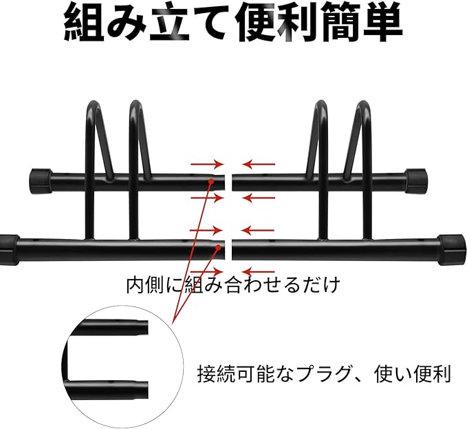 【梱包内容】自転車スタンド 2、アンカーボルト 8【サイズ】幅75cm 奥行31cm 高さ23cm 車輪幅5.5cm( こども 幼児車や原付/その他一部のタイヤに合わない場合がありますのでご了承ください。)従来の一段式サイクルラックとは異なり、2台の自転車を同時に収納できる。、便利性が一気にアップします。
