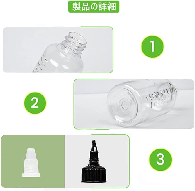 【目盛り付き】ボトルの表面には、10mlずつに目盛りが刻まれており、注入量を確認しながら作業するのに便利です。ボトルの本体が透明なので、中の液体の色がはっきりとわかります。異なる色の接着剤や塗料を確認する必要がある場合は、この透明ボトルが最適です。