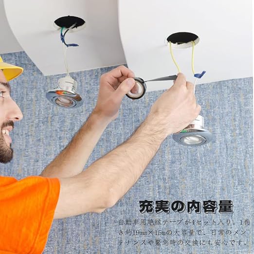 自動車用絶縁テープが4セット入り。1巻き約19mm 15mの大容量で、日常のメンテナンスや緊急時の交換にも安心です。