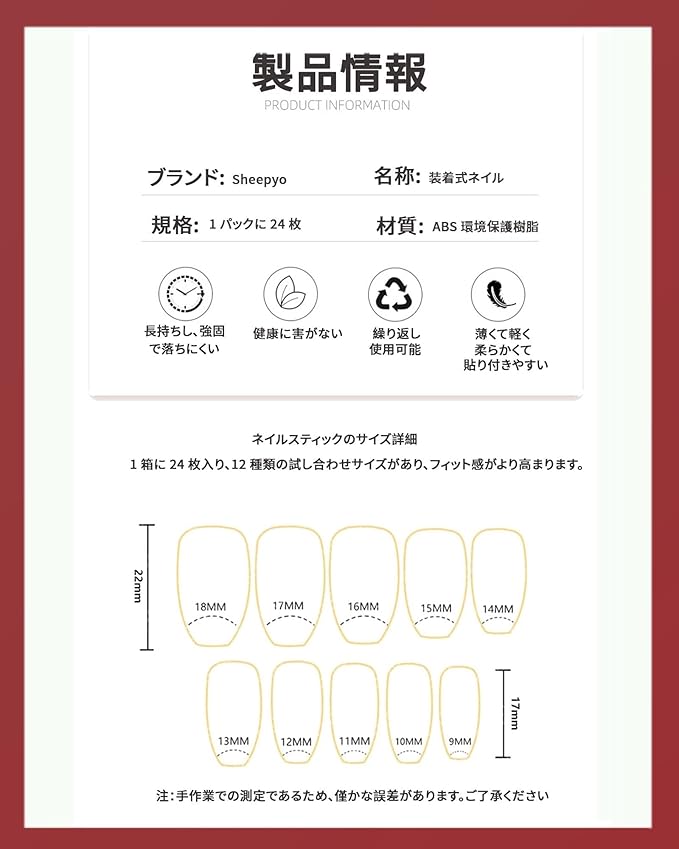 【豪華なセット内容で簡単に美しいネイルを実現】このネイルチップセットには、ネイルチップ24枚(12種類のサイズ)、付替え用両面テープ24枚、爪やすり1個、ウッドスティック1個が含まれています。自宅で簡単にプロフェッショナルなネイルアートを完成させることができ、わずか5分でサロンのような仕上がりを楽しめます。