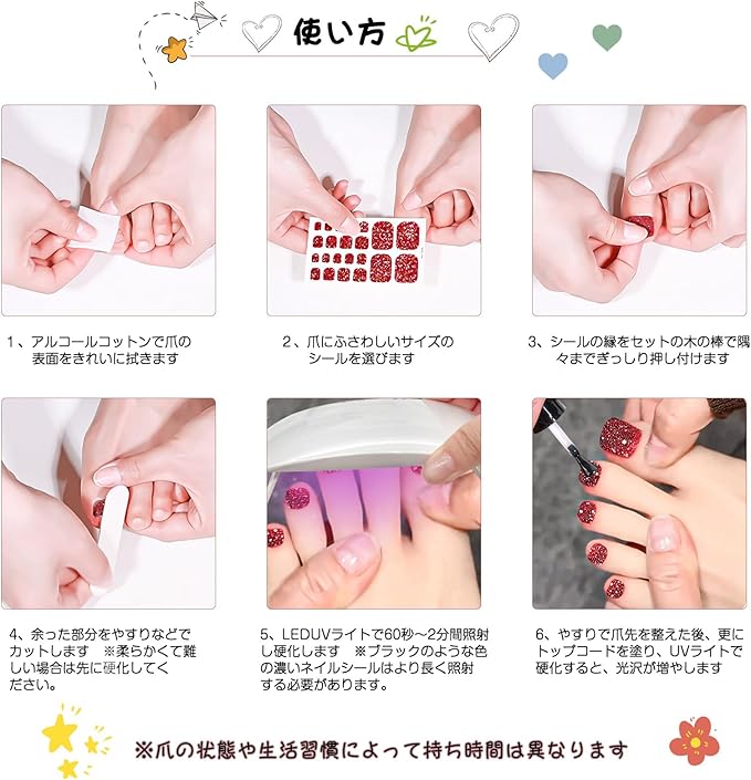 【長持ち 剥がれにくい】硬化タイプのペディキュアシールなので、UVライトを照射した後ははがれにくく、3週間ほど保つことができます。ご注意:爪の状態や生活習慣によって持ち時間は異なります