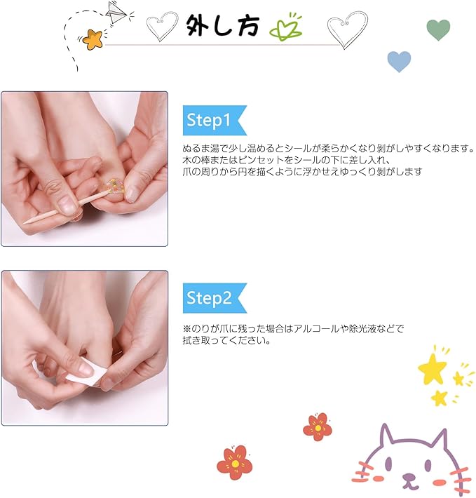 【ツール付き】セット内容:密封の足用ジェルネイルシール1シート32枚、爪やすり1枚、ネイルスティック1本、コットン2枚が入っており、ご自宅でのネイルアートをより便利になります