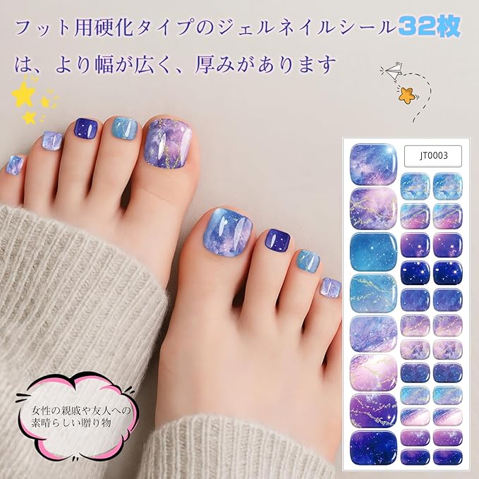 フットネイルシール ジェルネイルシール フット 硬化タイプ 貼るだけ ペディキュアシール ネイルシール 足 足用 ジェル 硬化 初心者 水に強い 長持ち ツール付き パープル系 S03
