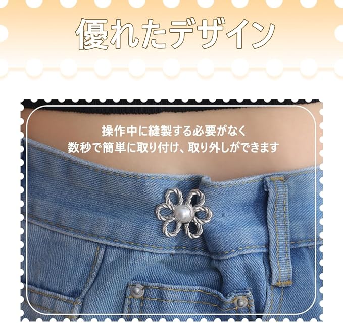 【操作簡単】ウエストサイズを測り、ボタンピンをパンツのウエストの正しい位置に留めます。右のボタンを左のボタンホールに通すだけです。ボタンピンが所定の位置に配置されたら、右のボタンを左のボタンホールに押し込むだけです。