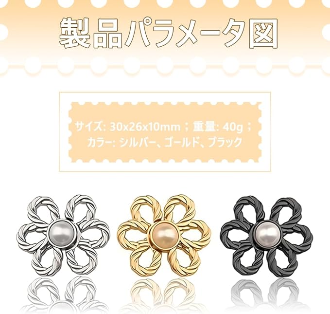 【商品仕様】この調節可能な花型ウエストバックルのサイズは30mmで、銀色の六弁花、金色の六弁花、黒色の六弁花が各2個ずつ、合計6個のボタンが含まれています。それぞれのボタンが、どんなファッションアイテムにも優雅な雰囲気を加えます。