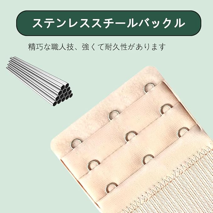 【製品サイズ】縦9.7cm 横5.5cm ホック間隔1.9cmカラー:肌色、黒、白、アプリコット 【製品素材】製品の材質はポリエステル+ステンレスです 弾力性、色落ちしにくいので、洗濯粉、石鹸、洗剤を使っても色落ちしません。 【耐久性】サビに強いステンレス製ホックを採用繰り返し使用に耐える構造 【主な用途】体型変化時のサイズ調整補助妊娠期/産後/授乳期等の体型変動に伴うサイズ調整をサポート体重増減によるブラジャーのフィット感改善に活用可能新しいブラジャーを買うより経済的です。 【使用が簡単】エクステンダーをブラジャーのフックとループに取り付け、現在使用しているブラジャーのフックをエクステンダーのフックとループに取り付けます。ブラジャーの長持ちできることによってお金を節約できます。