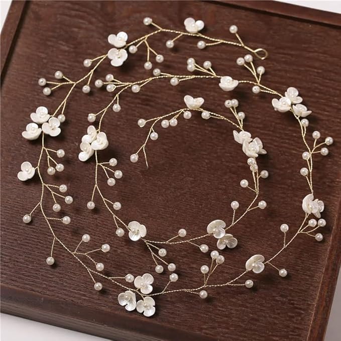 【華やかヘアアクセ】ゴールドワイヤーに白い花と真珠をあしらった上品なデザイン。髪を華やかに演出する結婚式向けアクセサリー 【サビに強い素材】軽くて曲げやすい合金ワイヤー+樹脂製の花。ドレスアップ時の使用に適した長持ちする作り 【100cmのたっぷり長さ】髪を束ねたり編んだり自由にアレンジ可能。和装にも洋装にも合わせやすい清楚なデザイン 【やさしいフィット感】手で曲げられるフレキシブルワイヤー。頭の形に合わせて自然になじむ柔らかさ 【特別な日のお供に】七五三・成人式・結婚式などフォーマルシーンで活躍。思い出の写真撮影にもおすすめ