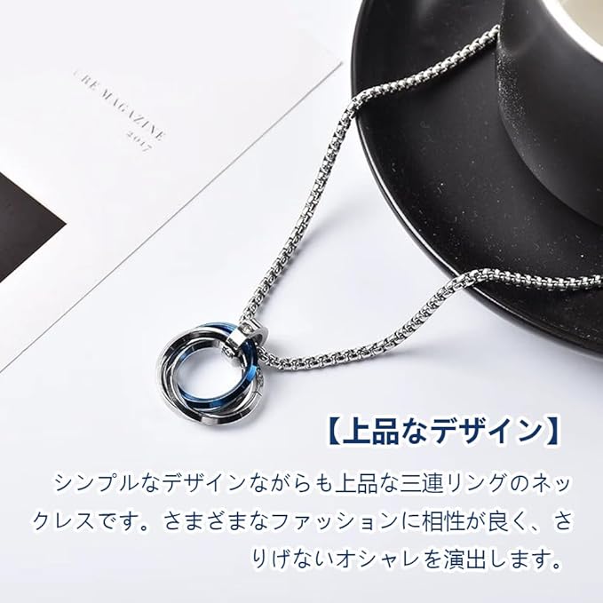 【上品なデザイン】 シンプルなデザインながらも上品な三連リングのネックレスです。さまざまなファッションに相性が良く、さりげないオシャレを演出します。 【材質】材質は高品質のチタン鋼です。 【耐久性】高品質のチタン鋼は、耐腐食性が高く、非常に硬い金属であるため、お手入れが簡単なアクセサリー素材です。ただし、アクセサリを長持ちさせるには定期的なメンテナンスが重要です。中性洗剤で洗い、清潔な布で水分を拭き取ってください。 【シンプルでオシャレなデザイン】ちょうど良い存在感が魅力のシンプルネックレスです。シンプルなデザインですが存在感があります。デザイン性をお求めの方に人気です。シンプルなツイストデザインを採用。スタイリッシュで分厚いこの人気のメンズネックレスは、あなたの服装を格上げし、あなたをさらに人気者にしてくれること間違いなしです! 【プレゼントに最適】本ネックレスはシンプルなデザインで、どなたにでも気に入っていただけるデザインです。プレゼントとしても喜ばれる一品です。父の日、バレンタインデー、誕生日、結婚式、友達 プレゼント、恋人 プレゼント、クリスマス、ホワイトデーなどのプレゼントに是非ご利用ください。