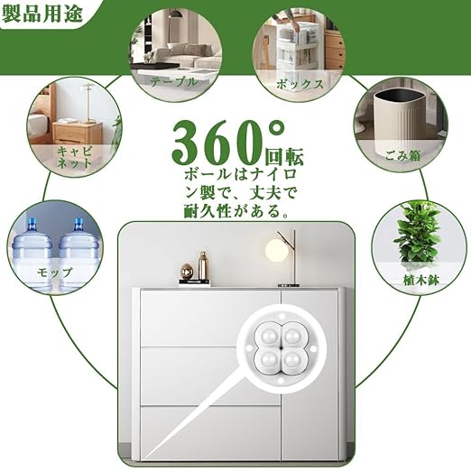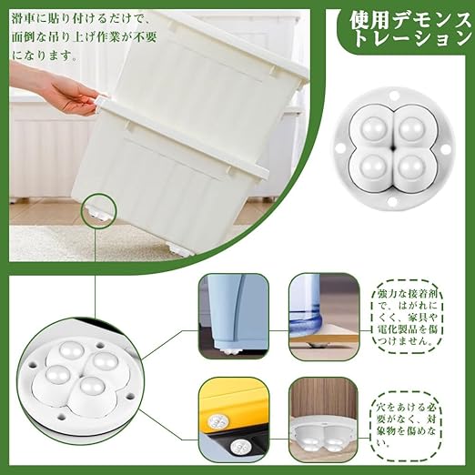 【使用方法】1まず、湿らせた布で、貼り付ける底面の汚れを拭き取り、十分に乾燥させる。2次に、ホイールの裏側の粘着紙を、紙の表面に触れないようにゆっくりとはがします。3次に、底面の四隅に車輪を固定し、車輪に均等に荷重がかかるように位置を合わせます。4最後に、ホイールをしっかりと固定するために、しっかりと押さえます。