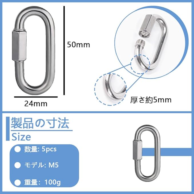 カナビラ 5個入り M5モデル 耐食性 耐錆性 耐摩擦性 ステンレス カラビナ リングキャッチ カラビナ ロック付き小型 固定チェイン 多機能 固定チェイン リングキャッチ登山/救助/洞窟探検