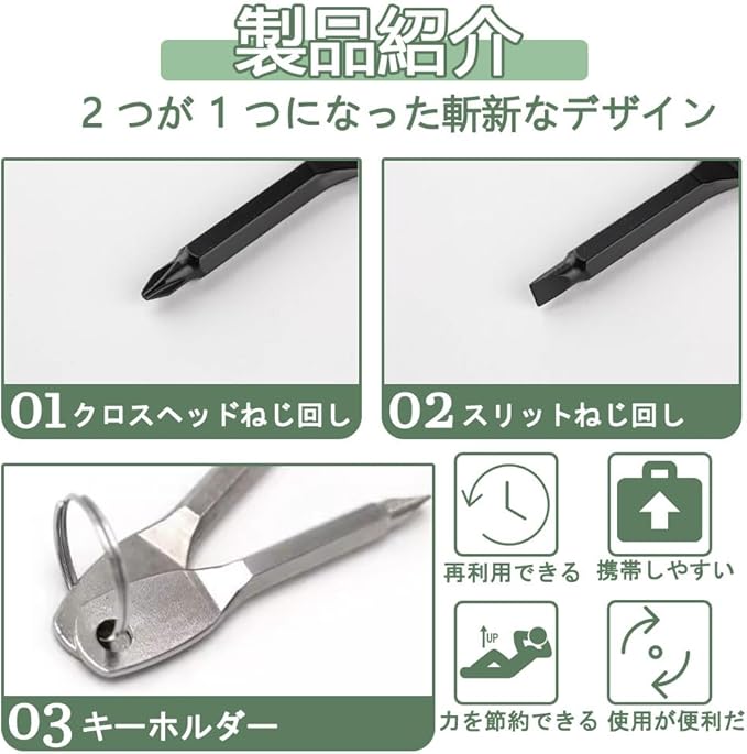 【商品紹介】 これは鍵型ドライバーセットで、クロスヘッドとスリットヘッドが各1本ずつ入っています。コンパクトなサイズで、キーホルダーにも使える便利なツールです。