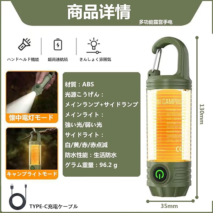 ✅【6種類モード &3色切替& SOSモード】このランタンは3種の点灯モードを提供:懐中電灯モード 、ランタンモード、 SOSモード 。ランタンのスイッチを押しすることにより白色・電球色・昼光色・赤色光・赤色光点滅(SOS点滅)無段階調光調色もでき、ご利用シーンに応じて自由に設置できます。ランタンのSOSモードを設定することもでき、安全性を高めています。 ✅【超急速充電|最長10時間駆動の大容量LEDランタン】当社のLEDランタンは、わずか2時間でフル充電可能な大容量バッテリーを搭載。このランタンは低輝度で10時間、高輝度で2時間の連続使用が可能。Type-C充電対応のLEDランタンだから、繰り返し充電でき経済的。電池交換不要のこのランタンは、アウトドア愛好者に最適です。 ✅【耐用性抜群&IPX6防水性能】このLEDランタンは、高品質のABS+PC高透過カバー材料を使用しており、耐衝撃性、耐熱性、耐摩耗性を備えています。さらに、IPX6防水防塵性能を備えており、一般的な雨水や塵から保護されます。屋外環境の変化を気にする必要がなく、雨や雪などの天候に影響されずにご使用いただけます。アウトドア愛好家向けの本格的なマルチライトです! ✅【96g超軽量|多様設置可能なコンパクトLEDランタン】 わずか96gの超軽量LEDランタン。滑り止めラバーベースを採用したこのランタンは、テーブル設置に最適。さらにこのLEDランタンは吊り下げフック付きで、テント内や作業現場でも便利に使用可能。13 3.5 2.5cmのコンパクトサイズのランタンは、持ち運びに便利です。 ✅【軽量小型&携帯便利】キャンプランタンはわずか約97gと軽量で、コンパクトな構造のため、外出時に荷物の中で占めるスペースが非常に少なく、持ち運びが非常に便利です。アウトドアライトとして簡単に携帯できるだけでなく、夜間の旅行時の携帯用ライトやナイトライトとしてもご利用いただけます。シンプルで洗練されたデザインは、日常のインテリアやキャンプの雰囲気ライトとしても最適です。また、防災ライトとしてもご利用いただけます。停電や地震などの災害時に照明を提供します。