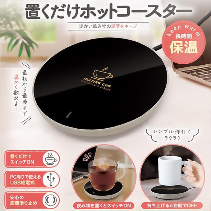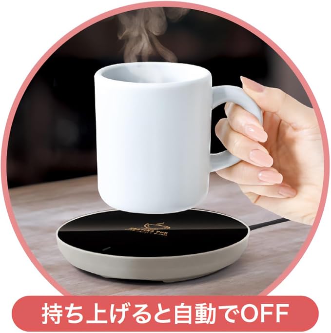 簡単操作&自動ON/OFF 温かい飲み物を入れたカップを置くだけで、自動でスイッチが入りドリンクを長時間保温。オフィスでも自宅でも、いつでもあたたかい飲み物を楽しめる便利なアイテムです。