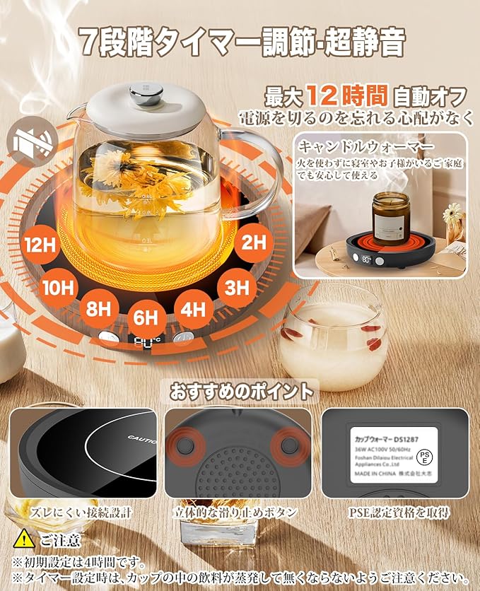 【超静音/7段階タイマー調節/超長12H】このマグカップウォーマーは0dB超静音作業は、お客様に優美で快適な使用体験をもたらします。2H、3H、4H、6H、8H、10H、12Hの自動オフ時間を設定でき、朝から夜まで最大12時間切タイマーは指定した時間が過ぎたら、自動的に電源が切れて仕事、勉強、ゲームに夢中で飲み物の最適温度を見逃すことを防ぎます。無駄な電力を節約できるだけでなく、電源を切るのを忘れる心配がなく手間もかからない!また、アロマキャンドルをウォーマーすることに使い、火を使わずに寝室やお子様がいるご家庭でも安心して使えます。 ご注意: ①初期設定は4時間です。 ②タイマー設定時は、カップの中の飲料が蒸発して無くならないようご注意ください。