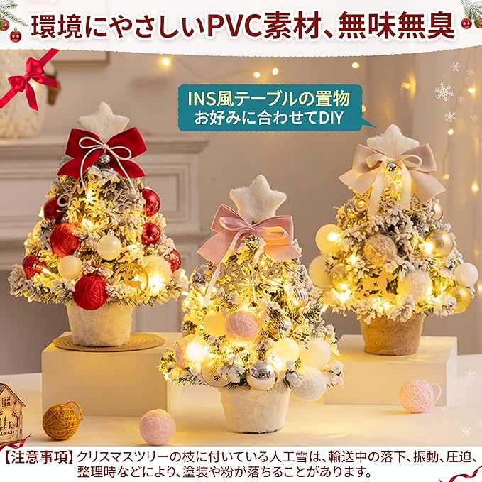 ✅【卓上クリスマスツリー】 高さ35cmのオリジナル卓上クリスマスツリーが新登場!❶枝と葉がしっかり絡み、針葉が落ちないように改良。❷広げた後、枝先の葉を整えてお好みの形に調整できます。セット内容:ツリー本体(高さ約35cm)+飾り+LEDイルミネーション。サイズ:高さ約35cm 幅約25cm/重量約285g。電源:単3乾電池2本(別売)。素材:プラスチック・布・木など。雪をイメージしたホワイト仕上げと美しいリボンが特徴のかわいらしいデザインです。本品はプレゼントにぴったりの専用箱に入ってお届けしますので、そのまま贈り物としてお使いいただけます。