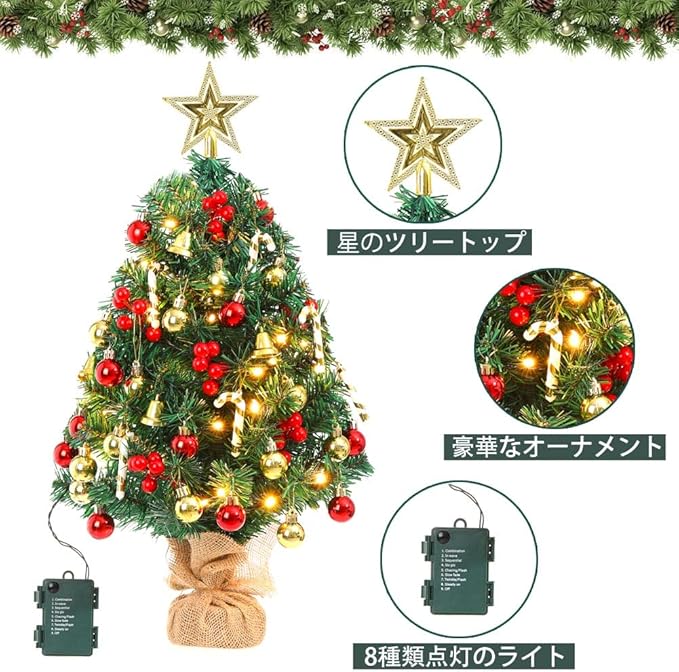 【LEDライト付き】暖かな白色ライトはツリーをキラキラと輝かせます。8つの点滅パターンがあり、ボタンを繰り返し押すだけで自分が好きな点滅パターンを選択します。(ご注意:電池が付属していません。)