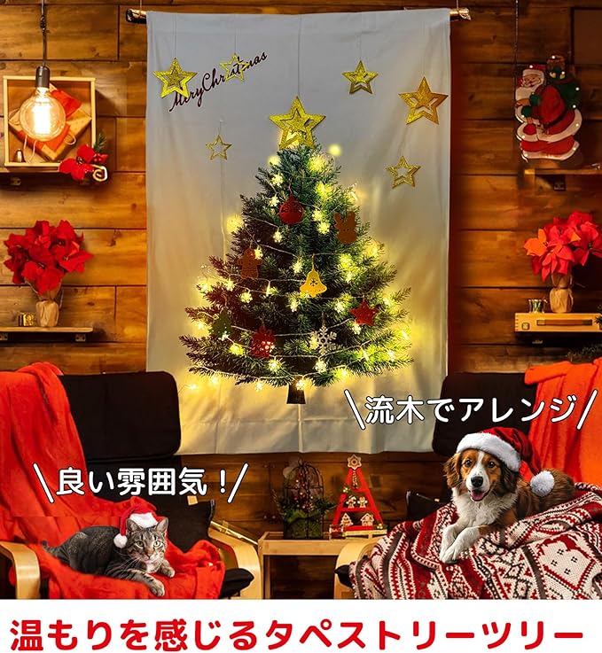 【 様々なシーンに】ご自宅用からお店のデコレーションなど様々なシーンにおすすめです。持ち運びも通常のツリーに比べて楽なのでレンタルスペースを借りたパーティーやイベントの装飾にも◎また、倒れる心配もないので小さなお子様やペットのいるご家庭にもおすすめです。タペストリーツリーでクリスマス気分を満喫しましょう♪