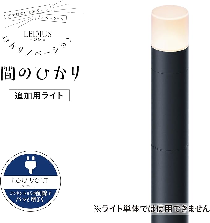 この追加用ライトの最大の特長は、**安全な12Vの低電圧設計**と、**既存のシステムへの簡単な組み込み**を実現する接続性です。ひかりノベーションシリーズの基本セットに付属、または別売されている**専用コントローラー(トランス)に接続**することで、専門知識や電気工事の資格なしに、ご自身の手でライトの数を増設できます。コントローラー1台あたり、本製品を含むライトを**最大8個まで追加連結が可能**です。これにより、システム全体の拡張性を最大限に活かし、庭の広範囲に光のリズムを作り出すことができます。