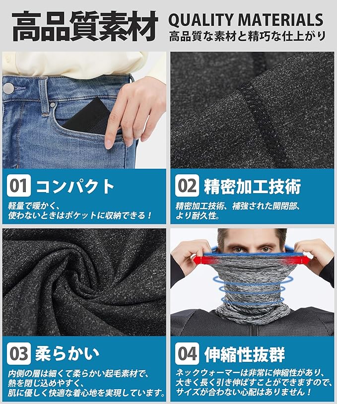 【防寒・防風・保温】: 薄手なのに暖かい…?!最新の保温技術で軽量化。 従来の分厚くかさばるネックガードと比べ、保温効果はそのままに、快適さは2倍にアップ! 内側の層は細くて柔らかい起毛素材で、熱を閉じ込めやすく、肌に優しく快適な着心地を実現しています。 ネックウォーマーは顔もカバー、いっそう保温効果を高めて、首をかばって耳までもしっかり保護して、冬季の冷たい風の侵略を防止できるネックウォーマーです。さらに、この多機能ネックウォーマーは内側から通気性(透湿性)があるので、運動中に蒸れを感じることはない。