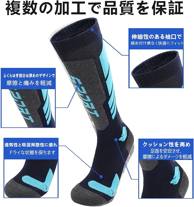 [保温性] スキーやスノーボード用に特別に設計されたこのソックスは、パッド仕上げで足を暖かく保ち、スキーやスノーボード中の寒さから解放された快適さを提供します。