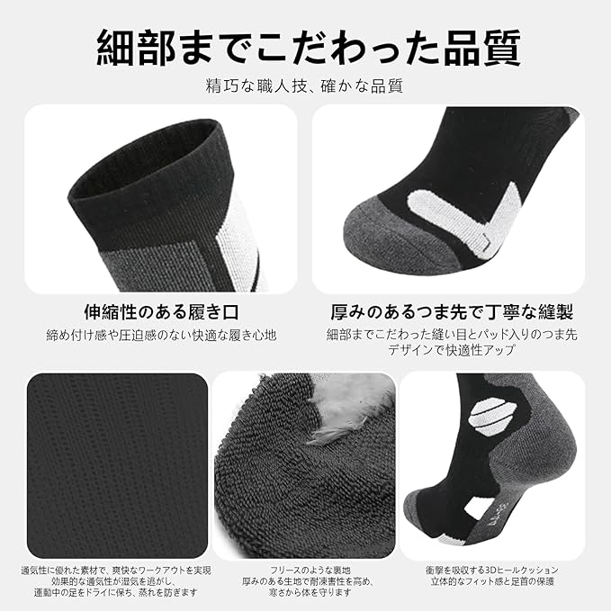 【耐久性と伸縮性】伸縮性のあるデザインが、快適性とクッション性を高めます。優れた伸縮性と圧縮性を備えた生地で、優れた保温性を発揮します。膝下まで伸びる伸縮素材がぴったりフィットし、アーチサポートと安定性を高めます。