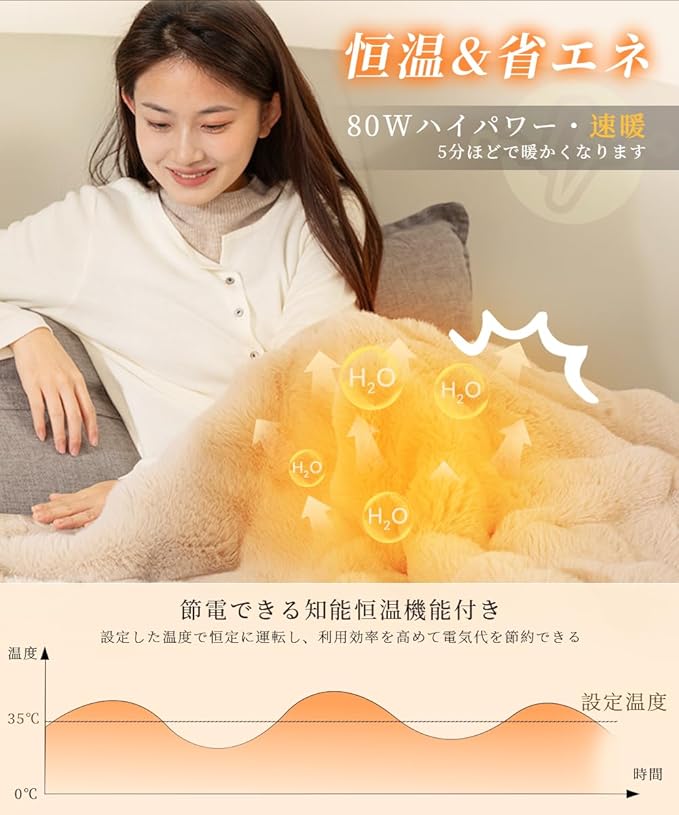 【6段階温度調整&自動オフタイマー】2/4/6/8/12時間のタイマー設定が可能で、切り忘れ防止に安心。さらに6段階の温度調整機能を搭載しており、体調や好みに合わせて最適な暖かさを選べます。就寝中も快適で安全な使い心地をサポート。
