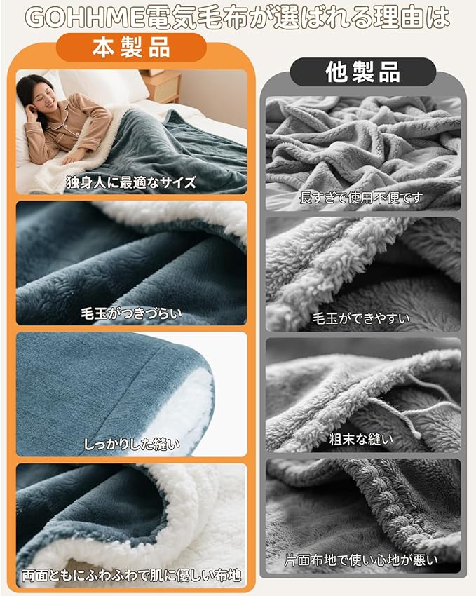 特徴 140 80cm一人サイズ, 掛け敷き兼用, 操作しやすいコントローラー, 省エネ&丸洗える, 高級両面使用可能仕様